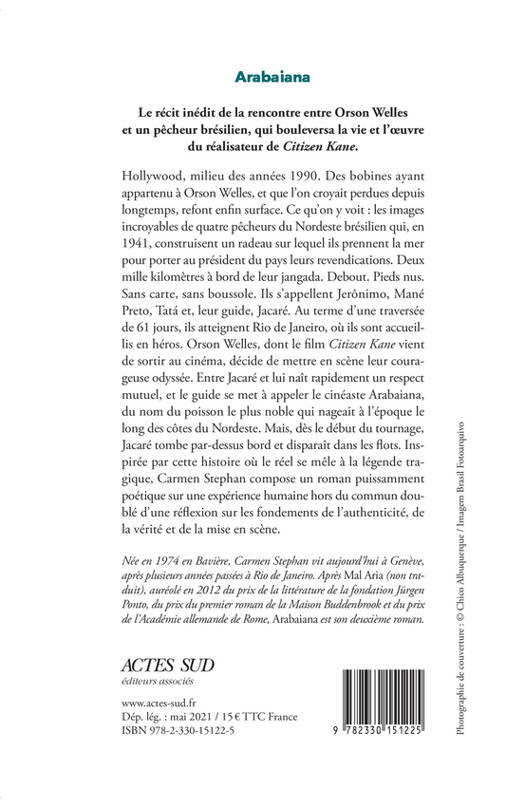 Hollywood, milieu des années 1990. Des bobines ayant appartenu à Orson Welles, et que l'on croyait perdues depuis longtemps, refont enfin surface. Ce qu'on y voit : les images incroyables de quatre pêcheurs du Nordeste brésilien qui, en 1941, construisent un radeau sur lequel ils prennent la mer pour porter au président du pays leurs revendications. Deux mille kilomètres à bord de leur jangada. Debout. Pieds nus. Sans carte, sans boussole. Ils s'appellent Jerônimo, Mané Preto, Tatá et, leur guide, Jacaré. Au terme d'une traversée de 61 jours, ils atteignent Rio de Janeiro, où ils sont accueillis en héros. Orson Welles, dont le film Citizen Kane vient de sortir au cinéma, décide de mettre en scène leur courageuse odyssée. Entre Jacaré et lui naît rapidement un respect mutuel, et le guide se met à appeler le cinéaste Arabaiana, du nom du poisson le plus noble qui nageait à l'époque le long des côtes du Nordeste. Mais, dès le début du tournage, Jacaré tombe par-dessus bord et disparaît dans les flots. Inspirée par cette histoire où le réel se mêle à la légende tragique, Carmen Stephan compose un roman puissamment poétique sur une expérience humaine hors du commun doublé d'une réflexion sur les fondements de l'authenticité, de la vérité et de la mise en scène.