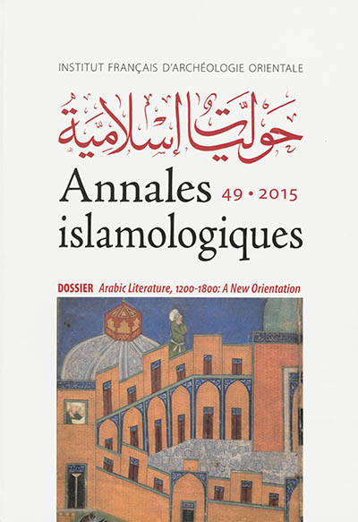 The 49th issue of the Annales islamologiques includes a folder and varia, as was the case of the preceding issues. The folder is called "Arabic Literature, 1200-1800: A New Orientation" and was edited by Monica Balda-Tillier and Adam Talib. An introduction and six articles describe the renewed interest for Arabic literature in the post-classical age through comprehensive case studies. The literary production in that period was characterized by the persistence and vitality of literary genres pertaining to the most classical adab, notably poetry and maqamat, as well as by the rise of new genres such as epic literature or the shadow theatre, and by its opening to a broader audience. The articles explore little known authors, pieces of poetry that survived only because they had been embedded in a chronicle, minor genres such as treatises on love, subjects deemed marginal such as robbers or hashish; they reveal the creative vitality of a period eager to explore new topics as well as new forms. Four varia articles in French and Arabic complete this issue: three of them deal with Mediaeval history and geography, one with the grammar of contemporary Arabic.