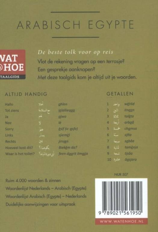 Wat & Hoe Taalgids Arabisch Egypte is de beste tolk voor op reis. Met ruim 4.000 woorden en zinnen kom je altijd uit je woorden. Vlot de rekening vragen? Een gesprekje aanknopen? Met deze taalgids lukt het allemaal. Ook kun je met deze gids eigen zinnen maken met behulp van de woordenlijst achterin. In veel hoofdstukken is een alfabetische lijst van termen opgenomen inclusief duidelijke aanwijzingen voor uitspraak. Bovendien kun je deze gids ook gebruiken als een eerste hulpmiddel bij het leren van de taal. De Wat & Hoe Taalgidsen zijn al meer dan 75 jaar verkrijgbaar en staan bekend om hun kwaliteit en volledigheid. De Taalgidsen worden uitgegeven in samenwerking met Van Dale.
