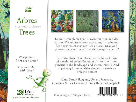 Le petit caméléon Léon s'invite au royaume des arbres. Communs ou remarquables, ils rythment les paysages et inspirent les artistes. Et quand pousse une forêt, la terre entière respire mieux ! Oeuvres de : Lisa Graa Jensen, Klimt, Van Gogh, Gauguin, Rousseau, Rebecca Campbell...