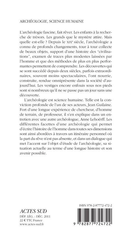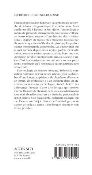 L'archéologie fascine, fait rêver. Les enfants à la recherche de trésors. Les grands que le mystère attire. Mais quelle est-elle ? Depuis le XIXe siècle, l'archéologie a connu de profonds changements, tour à tour collecte de beaux objets, support d'une histoire des "civilisations", examen de traces plus modestes laissées par l'homme et que des méthodes de plus en plus performantes permettent de comprendre. Les découvertes qui se sont succédé depuis deux siècles, parfois extraordinaires, souvent moins spectaculaires, l'ont nourrie, construite, rendue omniprésente dans la société d'aujourd'hui. Les vestiges encore enfouis sous nos pieds sont si nombreux qu'il ne se passe pas un jour sans une découverte. L'archéologie est science humaine. Telle est la conviction profonde de l'un de ses acteurs, Jean Guilaine. Fort d'une longue expérience de chercheur, d'homme de terrain, de professeur, il s'en explique dans un entretien avec une autre archéologue, Anne Lehoërff. Les différentes facettes d'une archéologie qui permet d'écrire l'histoire de l'homme dans toutes ses dimensions sont ainsi abordées à travers un itinéraire personnel où la part du rêve n'est pas absente, et dans un dialogue qui met l'accent sur l'objet d'étude de l'archéologie, sa situation actuelle au terme d'une longue histoire et son avenir possible.