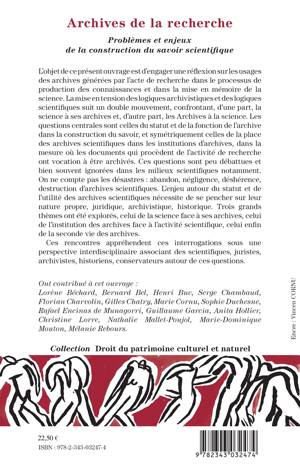 Ce livre engage une réflexion sur les usages des archives générées par l'acte de recherche dans le processus de production des connaissances et dans la mise en mémoire de la science. Quels sont le statut et la fonction de l'archive dans la construction du savoir, quelle est la place des archives scientifiques dans les institutions d'archives, et quelle pourrait être la seconde vie de ces archives ?