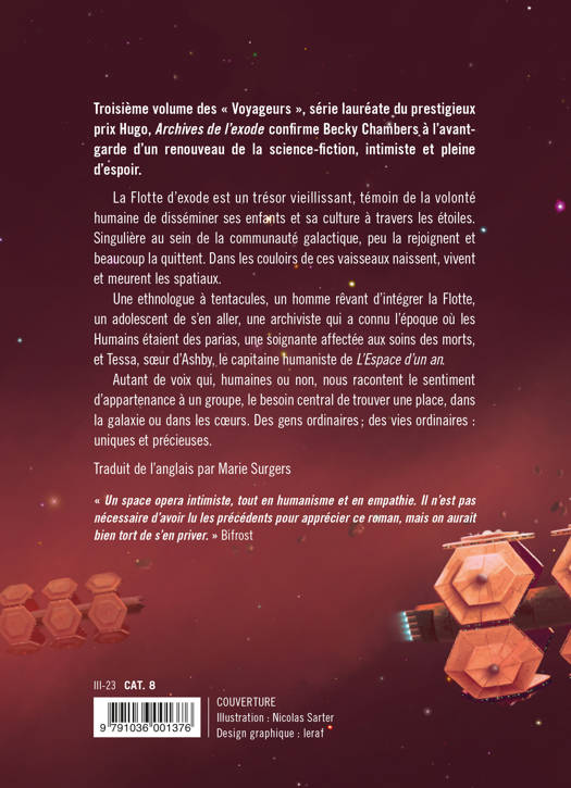 Troisième volume des « Voyageurs », série lauréate du prestigieux prix Hugo, Archives de l'exode confirme Becky Chambers à l'avant-garde d'un renouveau de la science-fiction, intimiste et pleine d'espoir. La Flotte d'exode est un trésor vieillissant, témoin de la volonté humaine de disséminer ses enfants et sa culture à travers les étoiles. Singulière au sein de la communauté galactique, peu la rejoignent et beaucoup la quittent. Dans les couloirs de ces vaisseaux naissent, viventet meurent les spatiaux. Une ethnologue à tentacules, un homme rêvant d'intégrer la Flotte, un adolescent de s'en aller, une archiviste qui a connu l'époque où les Humains étaient des parias, une soignante affectée aux soins des morts, et Tessa, sœur d'Ashby, le capitaine humaniste de L'Espace d'un an.Autant de voix qui, humaines ou non, nous racontent le sentiment d'appartenance à un groupe, le besoin central de trouver une place, dans la galaxie ou dans les cœurs. Des gens ordinaires ; des vies ordinaires : uniques et précieuses. Traduit de l'anglais par Marie Surgers