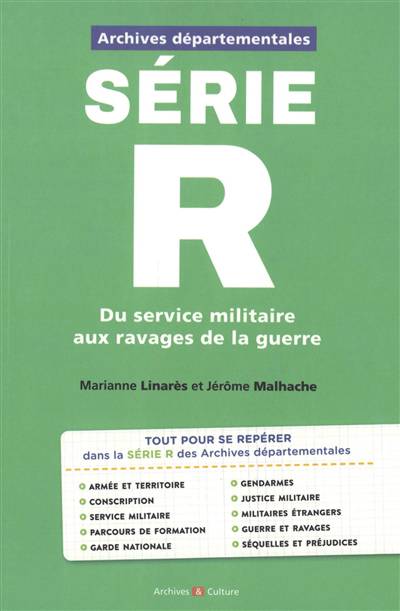 Au sein des services départementaux, la série R regroupe tout ce qui a trait à l'univers militaire, aussi bien en temps de guerre qu'en temps de paix. Pour épauler vos recherches, les informations et les conseils ont été structurés en dix mots-clés dans ce guide pratique : Armée et territoire, Conscription (recrutement avant 1867), Service militaire (organisation à partir de 1867), Parcours de formation (écoles et préparations militaires), Garde nationale, Gendarmes, Justice militaire, Militaires étrangers (envahisseurs et prisonniers), Guerre et ravages, Séquelles et préjudices (pour les pensionnés, vétérans, veuves et orphelins).