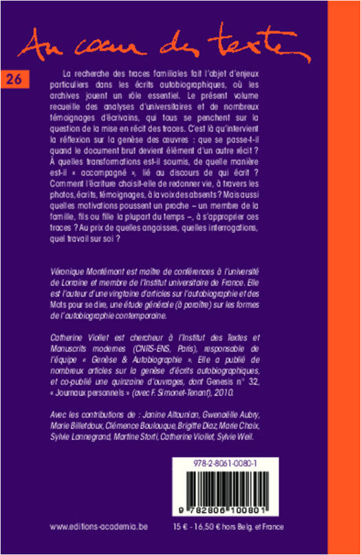 Écrire un récit de vie invite à s'appuyer sur des documents, à intégrer divers éléments d'archives publiques ou privées : carnets, journaux personnels, correspondance, articles de presse, photographies qui peuvent être à l'origine du récit, le soutenir ou l'accompagner. Ce livre propose des analyses d'universitaires et témoignages d'écrivains, qui se penchent sur la mise en récit de ces traces familiales : de quelle manière les intégrer au récit, les transformer, comment leur redonner vie ?