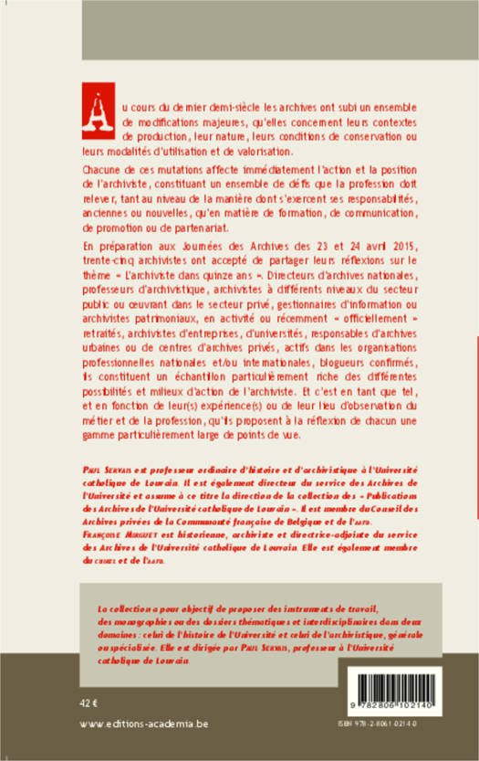 Les archives ont changé. Les gestionnaires de celles-ci doivent relever les défis de cette évolution. Trente-cinq d'entre eux issus de tous les milieux professionnels ont accepté de partager leurs réflexions, en fonction de leur(s) expérience(s) ou de leur angle d'observation, sur l'évolution de leur métier dans quinze ans.