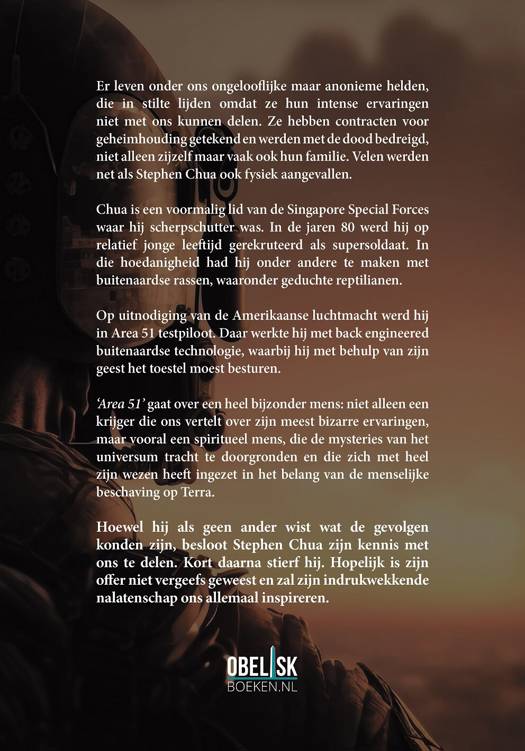 ‘Area 51’ gaat over een heel bijzonder mens: niet alleen een krijger die ons vertelt over zijn meest bizarre ervaringen, maar vooral een spiritueel mens, die de mysteries van het universum tracht te doorgronden en die zich met heel zijn wezen heeft ingezet in het belang van de menselijke beschaving op Terra.