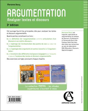 Cet ouvrage fournit les principales clés pour analyser les textes et discours argumentatifs. Quatre parties constituent ce livre : - une définition de l’argumentation comme articulation d’un discours à un contre-discours ; - un repérage de l’orchestration des points de vue au coeur de l’argumentation ; - une typologie des arguments et autres ressorts de l’argumentation ; - un inventaire des différents marqueurs langagiers sur lesquels s’appuie l’analyse des textes et discours argumentatifs. Des exercices corrigés concluent chaque chapitre.