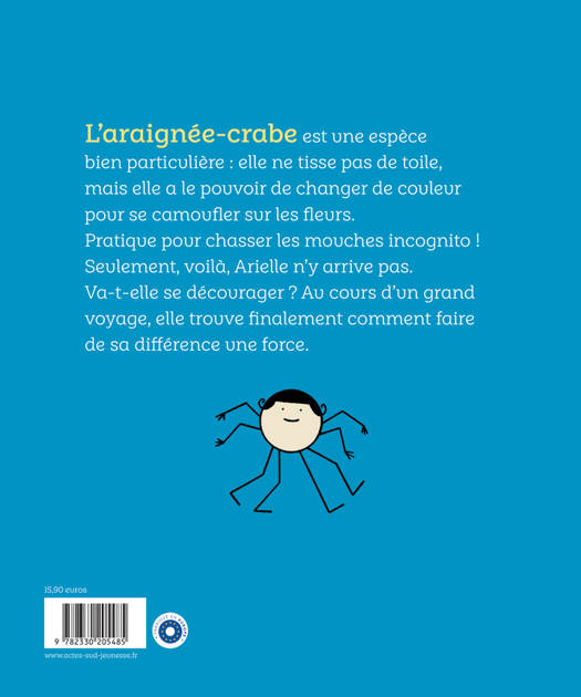 L'araignée-crabe est une espèce bien particulière : elle ne tisse pas de toile, mais elle a le pouvoir de changer de couleur pour se camoufler sur les fleurs. Pratique pour chasser les mouches incognito ! Seulement, voilà, Arielle n'y arrive pas. Va-t-elle se décourager ? Au cours d'un grand voyage, elle trouve finalement comment faire de sa différence une force.
