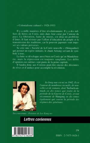Le colonialisme culturel de 1928 à 1933. Il y a mille manières d'être révolutionnaire. Il y a des milliers de héros en Corée, unis dans leur cœur par l'amour du pays. La libération, faute de mieux, est déjà un problème d'âmes. Il faut résister par l'effort d'éducation du peuple et la transmission des traditions, car le pouvoir japonais veut imposer ses valeurs perverses. Alors se crée une " Société de la Corée nouvelle " qui permet un repère unitaire, le chant Arirang servant de symbole à tous. Il faudra aux Coréens peut-être encore des décennies de rêves et d'audace pour accomplir la révolution.