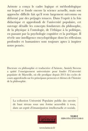 Aristote a conçu le cadre logique et méthodologique sur lequel se fonde encore la science actuelle, mais son approche difficile fait qu'il reste largement méconnu ou déformé par des préjugés tenaces. Dans l'esprit à la fois didactique et approfondi de l'université populaire, cet ouvrage détaille les concepts fondateurs du philosophe, de la physique à l'ontologie, de l'éthique à la politique, en passant par la psychologie cognitive et la poétique. Il révèle une intelligence encyclopédique dont les réflexions profondes et humanistes sont toujours aptes à inspirer notre pensée.