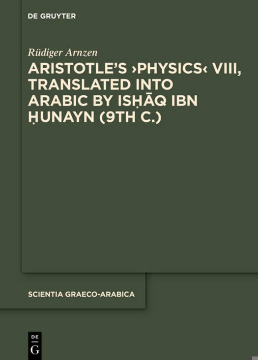 Aristotle's theory of eternal continuous motion and his argument from everlasting change and motion to the existence of an unmoved primary cause of motion, provided in book VIII of his Physics, is one of the most influential and persistent doctrines of ancient Greek philosophy. Nevertheless, the exact wording of Aristotle's discourse is doubtful and contentious at many places. The present critical edition of Ishaq ibn Hunayn's Arabic translation (9th c.) is supposed to replace the faulty edition by A. Badawi and aims at contributing to the clarification of these textual difficulties by means of a detailed collation of the Arabic text with the most important Greek manuscripts, supported by comprehensive Greek and Arabic glossaries.