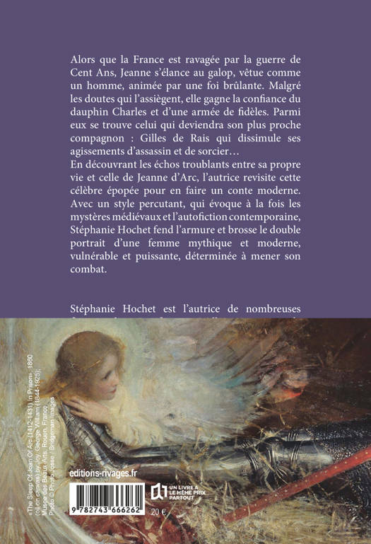 Alors que la France est ravagée par la guerre de Cent Ans, Jeanne s'élance au galop, vêtue comme un homme, animée par une foi brûlante. Malgré les doutes qui l'assiègent, elle gagne la confiance du dauphin Charles et d'une armée de fidèles. Parmi eux se trouve celui qui deviendra son plus proche compagnon : Gilles de Rais qui dissimule ses agissements d'assassin et de sorcier... En découvrant les échos troublants entre sa propre vie et celle de Jeanne d'Arc, l'autrice revisite cette célèbre épopée pour en faire un conte moderne. Avec un style percutant, qui évoque à la fois les mystères médiévaux et l'autofiction contemporaine, Stéphanie Hochet fend l'armure et brosse le double portrait d'une femme mythique et moderne, vulnérable et puissante, déterminée à mener son combat.