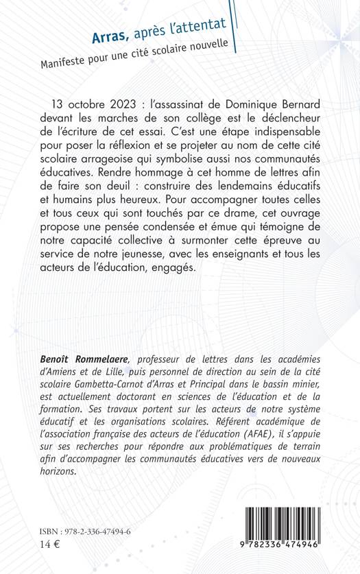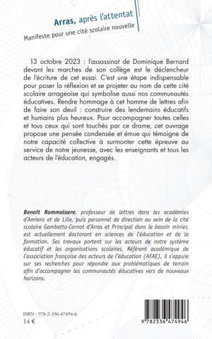 13 octobre 2023: l'assassinat de Dominique Bernard devant les marches de son collège est le déclencheur de l'écriture de cet essai. C'est une étape indispensable pour poser la réflexion et se projeter au nom de cette cité scolaire arrageoise qui symbolise aussi nos communautés éducatives. Rendre hommage à cet homme de lettres afin de faire son deuil: construire des lendemains éducatifs et humains plus heureux. Pour accompagner toutes celles et tous ceux qui sont touchés par ce drame, cet ouvrage propose une pensée condensée et émue qui témoigne de notre capacité collective à surmonter cette épreuve au service de notre jeunesse, avec les enseignants et tous les acteurs de l'éducation, engagés.