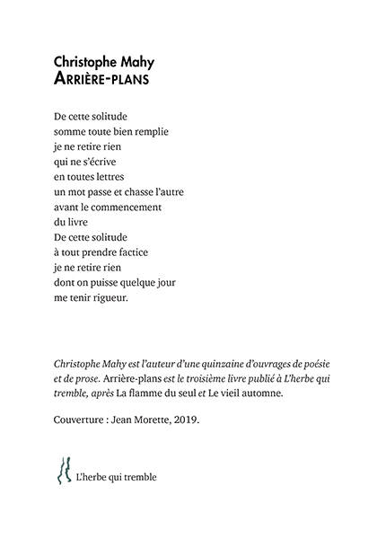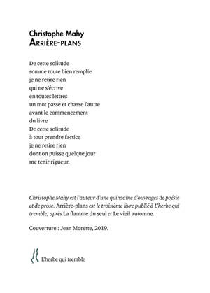« Arrière-plans » est la somme des poèmes écrits derrière la vitre où filtre la lumière des nuits et des aubes pluvieuses. Le poète y recense les sentiments qui le traversent durant les nuits de veille, propices à l’écriture, où le temps ralenti conduit la pensée à méditer, sur soi-même, sur le temps, sur les désirs, s’abandonnant à la mélancolie.