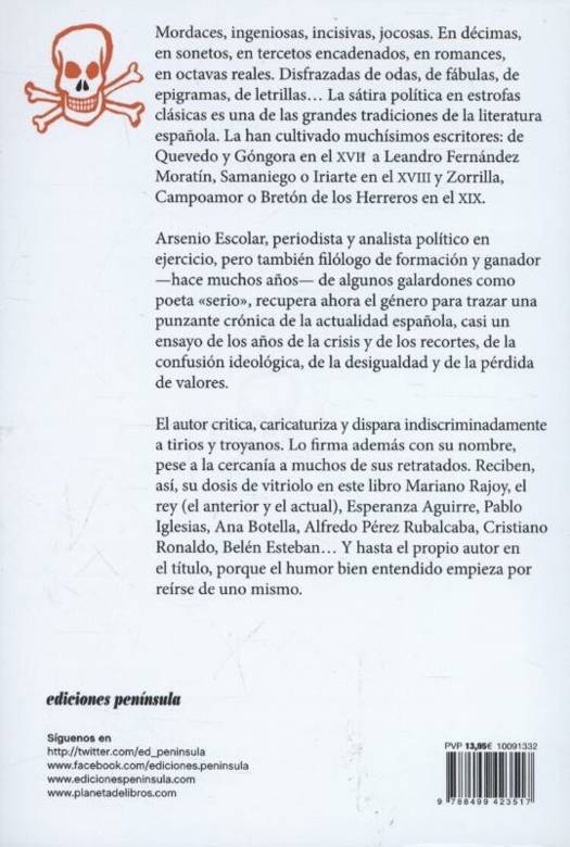 Mordaces, ingeniosas, incisivas, jocosas. En décimas, en sonetos, en tercetos encadenados, en romances, en octavas reales. Disfrazadas de odas, de fábulas, de epigramas, de letrillas? La sátira política en estrofas clásicas es una de las grandes tradiciones de la literatura española. La han cultivado muchísimos escritores: de Quevedo y Góngora en el xvii áa Leandro Fernández Moratín, Samaniego o Iriarte en el xviii y Zorrilla, Campoamor o Bretón de los Herreros en el xix. Arsenio Escolar, periodista y analista político en ejercicio, pero también filólogo de formación y ganador ?hace muchos años? de algunos galardones como poeta «serio», recupera ahora el género para trazar una punzante crónica de la actualidad española, casi un ensayo de los años de la crisis y de los recortes, de la confusión ideológica, de la desigualdad y de la pérdida de valores. El autor critica, caricaturiza y dispara indiscriminadamente a tirios y troyanos. Lo firma además con su nombre, pese a la cercanía a muchos de sus retratados. Reciben, así, su dosis de vitriolo en este libro Mariano Rajoy, el rey (el anterior y el actual), Esperanza Aguirre, Pablo Iglesias, Ana Botella, Alfredo Pérez Rubalcaba, Cristiano Ronaldo, Belén Esteban? Y hasta el propio autor en el título, porque el humor bien entendido empieza por reírse de uno mismo. á