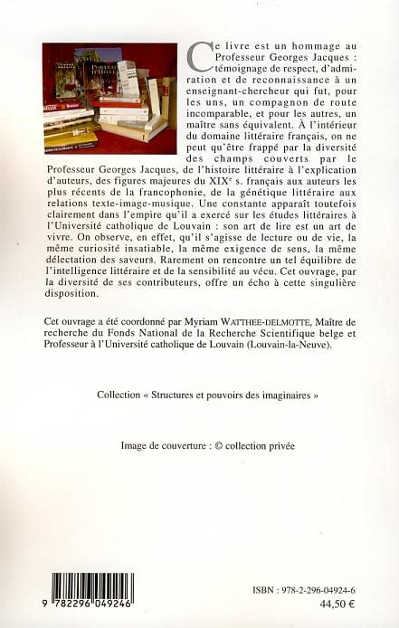 Hommage au Professeur Georges Jacques, ce livre est un témoignage de respect, d'admiration et de reconnaissance à un compagnon de route, pour les uns, et un maître sans équivalent pour les autres. La diversité des champs couverts par cet enseignant-chercheur en études littéraires frappe : histoire littéraire, explication d'auteurs, génétique littéraire, relations texte-image-musique. Son art de lire est un art de vivre. Rarement on rencontre un tel équilibre de l'intelligence littéraire et de la sensibilité au vécu.