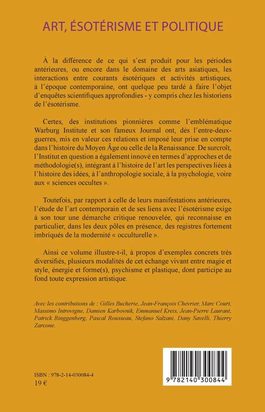 À la différence de ce qui s'est produit pour les périodes antérieures, ou encore dans le domaine des arts asiatiques, les interactions entre courants ésotériques et activités artistiques, à l'époque contemporaine, ont quelque peu tardé à faire l'objet d'enquêtes scientifiques approfondies - y compris chez les historiens de l'ésotérisme. Certes, des institutions pionnières comme l'emblématique Warburg Institute et son fameux Journal ont, dès l'entre-deux-guerres, mis en valeur ces relations et imposé leur prise en compte dans l'histoire du Moyen Âge ou celle de la Renaissance. De surcroît, l'Institut en question a également innové en termes d'approches et de méthodologie(s), intégrant à l'histoire de l'art les perspectives liées à l'histoire des idées, à l'anthropologie sociale, à la psychologie, voire aux « sciences occultes ». Toutefois, par rapport à celle de leurs manifestations antérieures, l'étude de l'art contemporain et de ses liens avec l'ésotérisme exige à son tour une démarche critique renouvelée, qui reconnaisse en particulier, dans les deux pôles en présence, des registres fortement imbriqués de la modernité « occulturelle ». Ainsi ce volume illustre-t-il, à propos d'exemples concrets très diversifiés, plusieurs modalités de cet échange vivant entre magie et style, énergie et forme(s), psychisme et plastique, dont participe au fond toute expression artistique.