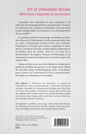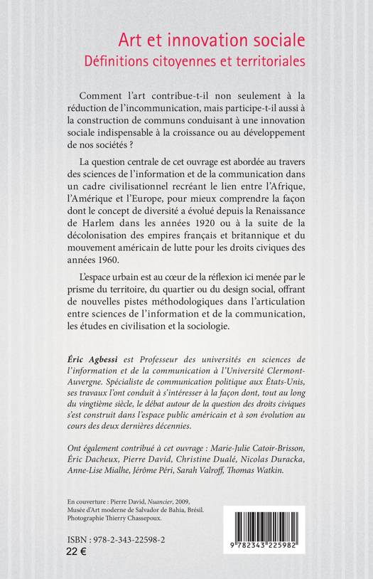 Comment l'art contribue-t-il non seulement à la réduction de l'incommunication, mais participe-t-il aussi à la construction de communs conduisant à une innovation sociale indispensable à la croissance ou au développement de nos sociétés ? La question centrale de cet ouvrage est abordée au travers des sciences de l'information et de la communication dans un cadre civilisationnel recréant le lien entre l'Afrique, l'Amérique et l'Europe, pour mieux comprendre la façon dont le concept de diversité a évolué depuis la Renaissance de Harlem dans les années 1920 ou à la suite de la décolonisation des empires français et britannique et du mouvement américain de lutte pour les droits civiques des années 1960.