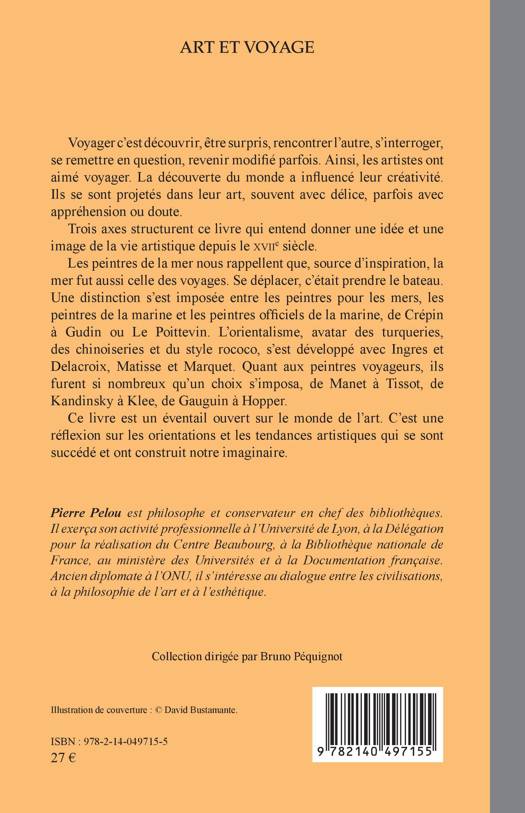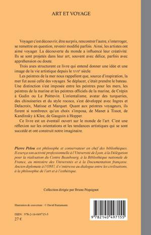 Voyager c'est découvrir, être surpris, rencontrer l'autre, s'interroger, se remettre en question, revenir modifié parfois. Ainsi, les artistes ont aimé voyager. La découverte du monde a influencé leur créativité. Ils se sont projetés dans leur art, souvent avec délice, parfois avec appréhension ou doute. Trois axes structurent ce livre qui entend donner une idée et une image de la vie artistique depuis le XVIIe siècle. Les peintres de la mer nous rappellent que, source d'inspiration, la mer fut aussi celle des voyages. Se déplacer, c'était prendre le bateau. Une distinction s'est imposée entre les peintres pour les mers, les peintres de la marine et les peintres officiels de la marine, de Crépin à Gudin ou Le Poittevin. L'orientalisme, avatar des turqueries, des chinoiseries et du style rococo, s'est développé avec Ingres et Delacroix, Matisse et Marquet. Quant aux peintres voyageurs, ils furent si nombreux qu'un choix s'imposa, de Manet à Tissot, de Kandinsky à Klee, de Gauguin à Hopper. Ce livre est un éventail ouvert sur le monde de l'art. C'est une réflexion sur les orientations et les tendances artistiques qui se sont succédé et ont construit notre imaginaire.