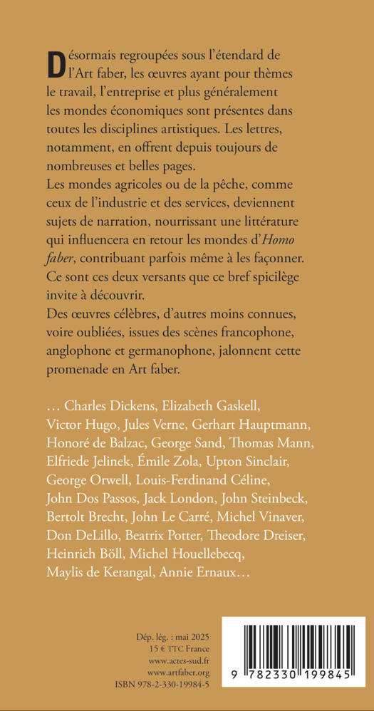 Désormais regroupées sous l'étendard de l'Art faber, les oeuvres ayant pour thèmes le travail, l'entreprise et plus généralement les mondes économiques sont présentes dans toutes les disciplines artistiques. Les lettres, notamment, en offrent depuis toujours de nombreuses et belles pages. Les mondes agricoles ou de la pêche, comme ceux de l'industrie et des services, deviennent sujets de narration, nourrissant une littérature qui influencera en retour les mondes d'Homo faber, contribuant à les façonner. Ce sont ces deux versants que ce bref spicilège invite à découvrir. Des oeuvres célèbres, d'autres moins connues, voire oubliées, issues des scènes francophone, anglophone et germanophone, jalonnent cette promenade en Art faber.
