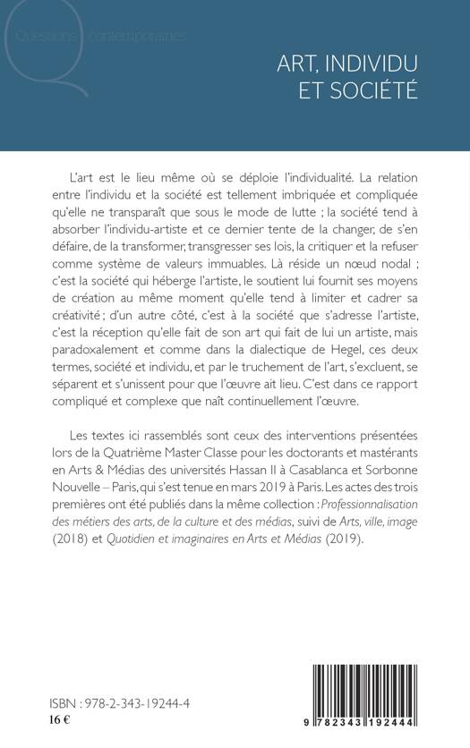 L'art est le lieu où se déploie l'individualité. La relation entre l'individu et la société est tellement imbriquée et compliquée qu'elle ne transparaît que sous le mode de la lutte ; la société tend à absorber l'individu-artiste et ce dernier tente de la changer et de s'en défaire, de la critiquer et de refuser ses valeurs immuables. Là réside un noeud nodal ; c'est la société qui héberge l'artiste, le soutient, lui fournit ses moyens de création au même moment qu'elle tend à limiter et cadrer sa créativité ; d'un autre côté, c'est à la société que s'adresse l'artiste, mais paradoxalement, société et individu, par le truchement de l'art, s'excluent, se séparent et s'unissent pour que l'oeuvre ait lieu.