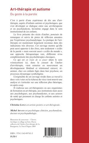 A partir d'une expérience de dix ans d'art-thérapie auprès d'enfants autistes et psychotiques s'est développé ce dialogue entre une art-thérapeute et un psychanalyste, lui-même engagé dans le soin institutionnel de ces enfants. Le livre présente des récits d'atelier, ponctués de remarques et suivis de pistes de réflexion amenées par l'expérience psychanalytique. Il montre comment l'art-thérapie peut apporter à ces "exilés de la parole", mais aussi « exilés du monde », une approche thérapeutique rare, différente et/ou complémentaire des psychothérapies classiques.