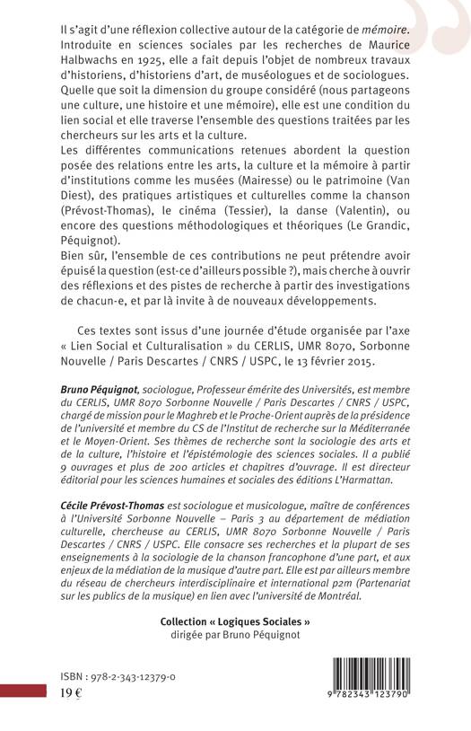 Quelle que soit la dimension du groupe considéré, la mémoire est une condition du lien social et elle traverse l'ensemble des questions traitées par les chercheurs sur les arts et la culture. Ces différentes communications abordent la question posée des relations entre les arts, la culture et la mémoire à partir d'institutions comme les musées ou le patrimoine, des pratiques artistiques et culturelles comme la chanson, le cinéma, la danse, ou encore des questions méthodologiques et théoriques.