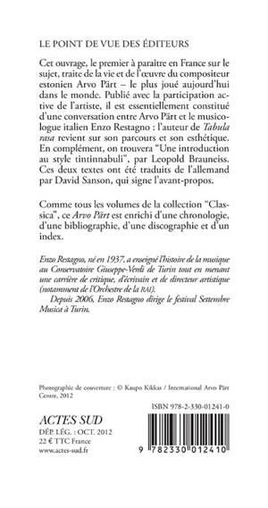 Cet ouvrage, le premier à paraître en France sur le sujet, traite de la vie et de l'oeuvre du compositeur estonien Arvo Pärt - le plus joué aujourd'hui dans le monde. Publié avec la participation active de l'artiste, il est essentiellement constitué d'une conversation entre Arvo Pärt et le musicologue italien Enzo Restagno. Pour la première fois, l'auteur de Tabula Rasa revient sur son parcours et son esthétique.
