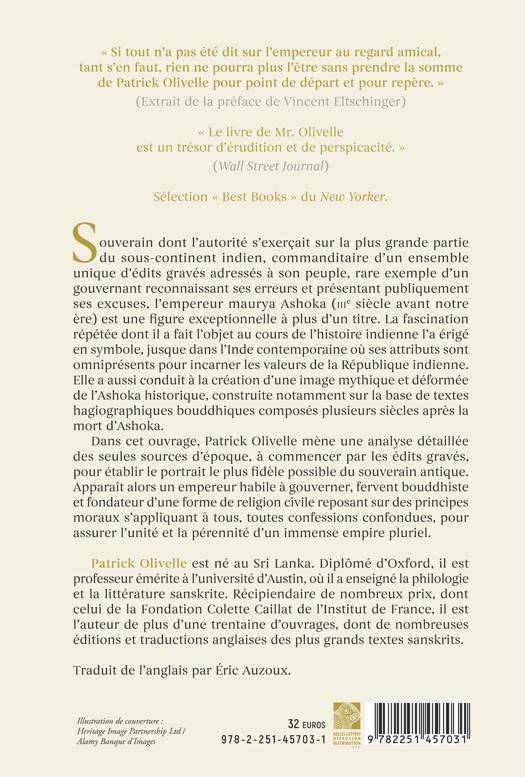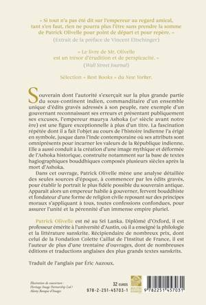 Dans cet ouvrage, Patrick Olivelle mène une analyse détaillée des seules sources d’époque, à commencer par les édits gravés, pour établir le portrait le plus fidèle possible du souverain antique. Apparaît alors un empereur habile à gouverner, fervent bouddhiste et fondateur d’une forme de religion civile reposant sur des principes moraux s’appliquant à tous, toutes confessions confondues, pour assurer l’unité et la pérennité d’un immense empire pluriel.