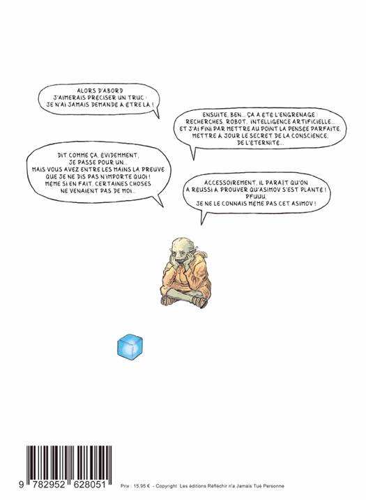 Une voix off dit à un personnage après l'avoir mis sur une planète paradisiaque où il y a tout pour être heureux, qu'un jour il va disparaître. Le personnage est surpris : « disparaître, c'est à dire ? » « Poussière redeviendra poussière » lui répond la voix off. « Mourir ? Mais c'est dégueulasse ! Qui a fait une règle du jeu pareille ? » Face à cette cruauté apparente, le personnage va tout faire pour devenir immortel. Il va avoir un enfant, une copie de lui-même croit-il, puis une statue, puis... jusqu'à un robot doté d'intelligence artificielle. Mais tout ne va pas se passer comme il l'entend car la bêtise, comme l'intelligence, n'ont aucune limite.