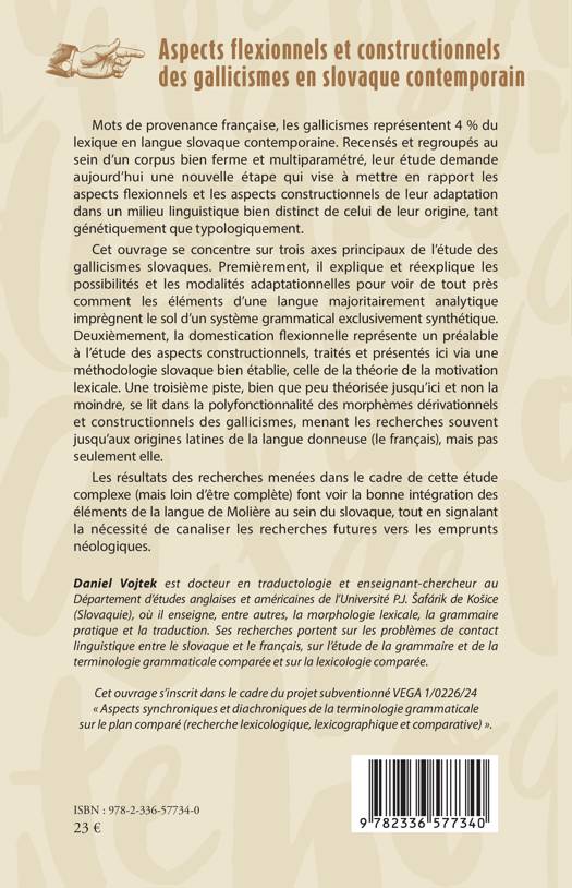 Mots de provenance française, les gallicismes représentent 4 % du lexique en langue slovaque contemporaine. Recensés et regroupés au sein dʼun corpus bien ferme et multiparamétré, leur étude demande aujourdʼhui une nouvelle étape qui vise à mettre en rapport les aspects flexionnels et les aspects constructionnels de leur adaptation dans un milieu linguistique bien distinct de celui de leur origine, tant génétiquement que typologiquement. Cet ouvrage se concentre sur trois axes principaux de lʼétude des gallicismes slovaques. Premièrement, il explique et réexplique les possibilités et les modalités adaptationnelles pour voir de tout près comment les éléments dʼune langue majoritairement analytique imprègnent le sol dʼun système grammatical exclusivement synthétique. Deuxièmement, la domestication flexionnelle représente un préalable à lʼétude des aspects constructionnels, traités et présentés ici via une méthodologie slovaque bien établie, celle de la théorie de la motivation lexicale. Une troisième piste, bien que peu théorisée jusquʼici et non la moindre, se lit dans la polyfonctionnalité des morphèmes dérivationnels et constructionnels des gallicismes, menant les recherches souvent jusquʼaux origines latines de la langue donneuse (le français), mais pas seulement elle. Les résultats des recherches menées dans le cadre de cette étude complexe (mais loin dʼêtre complète) font voir la bonne intégration des éléments de la langue de Molière au sein du slovaque, tout en signalant la nécessité de canaliser les recherches futures vers les emprunts néologiques.