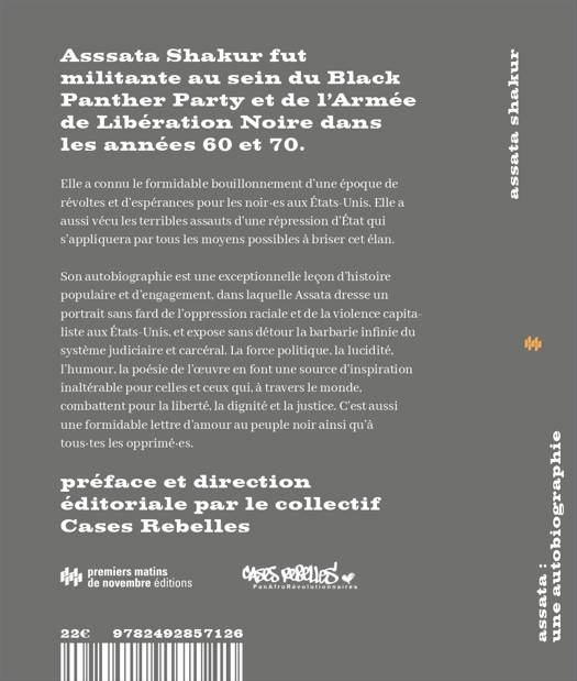 Assata Shakur fut, dans les années 60 et 70, militante du Black Panther Party et de l'Armée de Libération Noire. Elle a connu le formidable bouillonnement d'une époque de révoltes et d'espérances pour les Noirs des États-Unis, comme la répression. De sa tendre enfance à son exil à Cuba, ses souvenirs se structurent autour du récit d'un emprisonnement de six ans. Une exceptionnelle leçon d'histoire populaire et d'engagement dans laquelle Assata dresse un portrait sans fard de l'oppression raciale et de la violence capitaliste aux États-Unis. Cette autobiographie est une lettre d'amour au peuple noir ainsi qu'à tous les opprimés. Une source d'inspiration inaltérable pour celles et ceux qui, à travers le monde, exigent la dignité et la justice. Nouvelle édition corrigée.