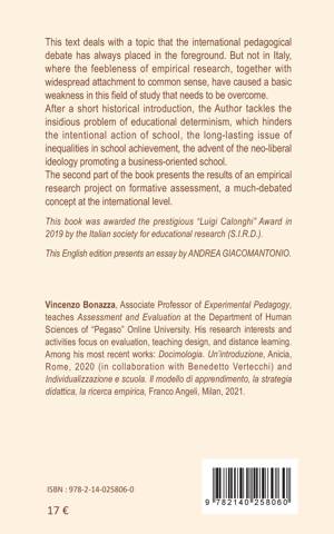 Une fois introduite la réalité italienne en matière d'éducation, l'auteur aborde les problèmes liés au déterminisme du système scolaire, incapable de surmonter les inégalités et porteur d'une idéologie néolibérale qui favorise un modèle d'enseignement « orienté vers le business ». La seconde partie du livre présente les résultats d'une étude empirique consacrée à l'évaluation formative en Italie. L'essai est enrichi per une contribution d'Andrea Giacomantonio.