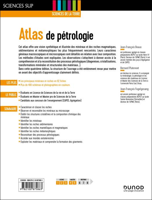Cette quatrième édition de l'atlas de pétrologie offre une vision synthétique et illustrée des minéraux et des roches magmatiques, sédimentaires et métamorphiques les plus fréquemment rencontrés. Leurs caractères généraux macroscopiques et microscopiques sont détaillés en relation avec leur composition. Les méthodes d’études sont expliquées : elles permettent de comprendre la signification des observations.