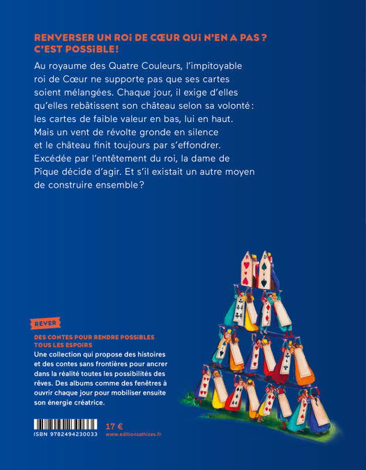 Au royaume des Quatre Couleurs, l'impitoyable roi de Coeur ne supporte pas que ses cartes soient mélangées. Chaque jour, il exige d'elles qu'elles rebâtissent son château selon sa volonté: les cartes de faible valeur en bas, lui en haut. Mais un vent de révolte gronde en silence et le château finit toujours par s'effondrer. Excédée par l'entêtement du roi, la dame de Pique décide d'agir. Et s'il existait un autre moyen de construire ensemble?