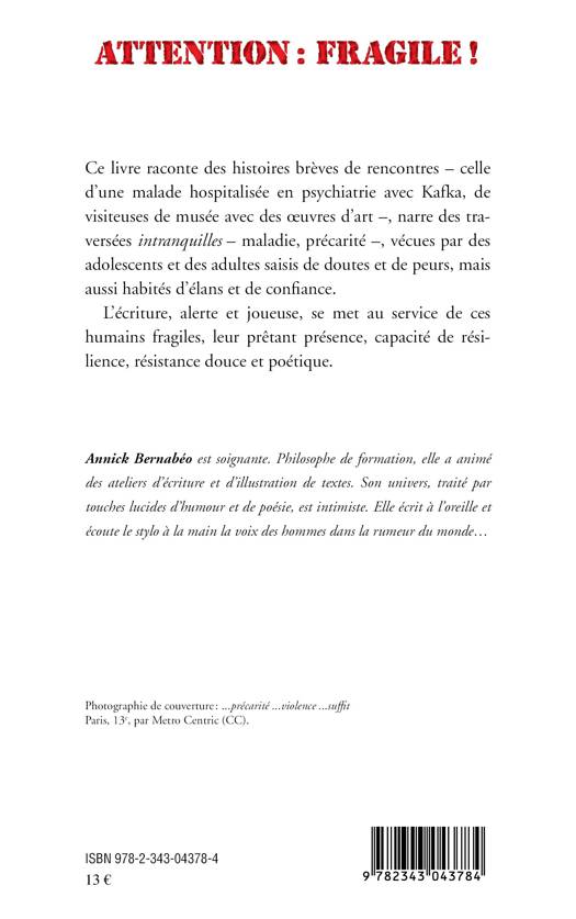 Ce recueil raconte des histoires brèves de rencontres- celle d'une malade hospitalisée en psychiatrie avec Kafka, de visiteuses de musée avec des œuvres d'art -, histoires de traversées intranquilles- maladie, précarité -, histoires vécues par des adolescents et des adultes saisis de doutes et de peurs, mais aussi habités d'élans et de confiance. L'écriture d'Annick Bernabéo, soignante de métier, se met au service de ces humains fragiles, leur prêtant présence, capacité de résilience, résistance douce et poétique.