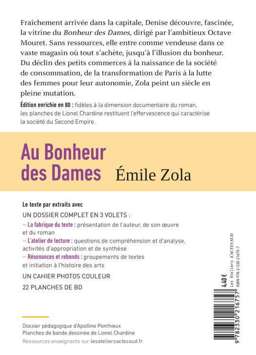 Fraîchement arrivée dans la capitale, Denise découvre, fascinée, la vitrine du Bonheur des Dames>, dirigé par l'ambitieux Octave Mouret. Sans ressources, elle entre comme vendeuse dans ce vaste magasin où tout s'achète, jusqu'à l 'illusion du bonheur. Du déclin des petits commerces à la naissance de la société de consommation, de la transformation de Paris à la lutte des femmes pour leur autonomie, Zola peint un siècle en pleine mutation. Édition enrichie en BD : fidèles à la dimension documentaire du roman, les planches de Lionel Chardine restituent l'effervescence qui caractérise la société du Second Empire. Le texte par extraits avec UN DOSSIER COMPLET EN 3 VOLETS : - La fabrique du texte : présentation de l'auteur, de son oeuvre et du roman - L'atelier de lecture : questions de compréhension et d'analyse, activités d'appropriation et de synthèse - Résonances et rebonds : groupements de textes et initiation à l'histoire des arts UN CAHIER PHOTOS COULEUR 22 PLANCHES DE BD