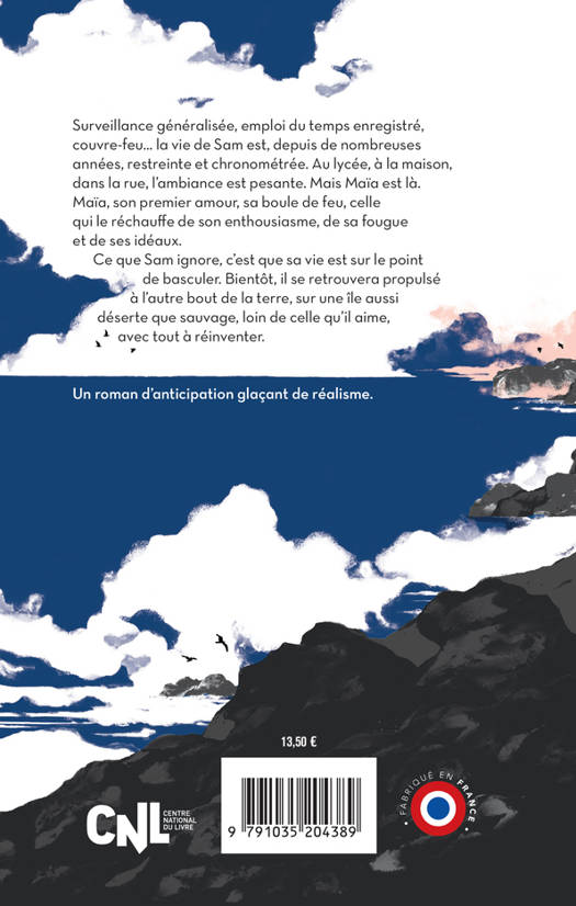 Surveillance généralisée, emploi du temps enregistré, couvre-feu... la vie de Sam est, depuis de nombreuses années, restreinte et chronométrée. Au lycée, à la maison, dans la rue, l'ambiance est pesante. Mais Maïa est là. Maïa, son premier amour, sa boule de feu, celle qui le réchauff e de son enthousiasme, de sa fougue et de ses idéaux. Ce que Sam ignore, c'est que sa vie est sur le point de basculer. Bientôt, il se retrouvera propulsé à l'autre bout de la terre, sur une île aussi déserte que sauvage, loin de celle qu'il aime, avec tout à réinventer.