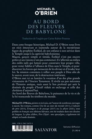 Dans cette fresque historique, Michael D. O'Brien nous livre un récit émouvant et inattendu autour de la mystérieuse figure du prophète Ézékiel, de son enfance à son service dans le Temple jusqu'à la captivité babylonienne. Maçon, garçon simple et timide, Ézékiel n'est pas encore prêtre et ses visions n'ont pas commencé. Il s'affermit au milieu des exilés juifs qui luttent pour construire leur propre ville, pour rester fidèles à l'alliance de Dieu sans le Temple, et pour discerner les forces qui menacent de les diviser et d'éroder leur foi. Sa mission consistera à rallier son peuple à Dieu afin de le sauver, avant tout, de la destruction intérieure. O'Brien met ici en lumière la vocation d'un des plus grands visionnaire de l'Ancien Testament. Il révèle un pan méconnu de l'histoire antique, mais aussi le lien profond qui unit la destinée du peuple d'Israël réduit en esclavage et celle des chrétiens d'aujourd'hui. Au bord des fleuves de Babylone, la puissance de la vie et de la foi transcende les ténèbres du monde. Traduction de l'anglais par Carine Rabier-Poutous Michael D. O'Brien, peintre et écrivain, est l'auteur de nombreux ouvrages à succès. Ses romans, comme Une île au coeur du monde (2011), L'odyssée du père (2013), Étrangers et de passage (2017) ou Le phare (2021), tous publiés en français aux éditions Salvator, ont été traduits dans une dizaine de langues. Le plus célèbre, Père Elijah : une apocalypse, a également été adapté en bande dessinée.