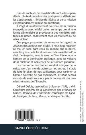 Dans le contexte de nos difficultés actuelles – pandémie, chute du nombre des pratiquants, débats sur les abus sexuels-l’image de l’Eglise et de sa mission est profondément remise en questions. Il s’agit d’un affrontement nouveau de la mission évangélique avec le Mal qui en ce temps prend une forme démentielle et provoque à des multiples attitudes de désenchantement chez les chrétiens ou de refus violent. Ces pages proposent de retrouver le regard de Jésus et des apôtres sur le Mal. Il nous faut regarder ce mal en face, tant celui du monde que le nôtre, avec les yeux de la foi et non ceux des résultats d’un chef d’entreprise, avec le sens de l’humilité et non la hantise de la domination politique, avec les valeurs de la faiblesse et non celles de la violence guerrière. La crise vécue en chrétien conduit à la joie de la naissance d’un monde autre par les autres.