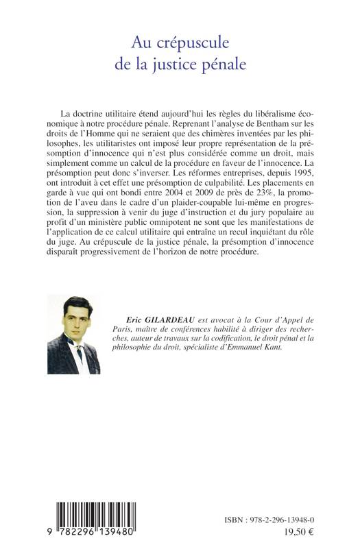La doctrine utilitaire impose aujourd'hui une vision nouvelle de la présomption d'innocence, qui n'est plus un droit mais un calcul de la procédure en faveur de l'innocence. La présomption peut s'inverser et devenir présomption de culpabilité. L'augmentation significative des placements en garde à vue, la promotion de l'aveu dans le cadre d'un plaider-coupable, la suppression annoncée du juge d'instruction et du jury populaire au profit d'un ministère public omnipotent ne sont que l'application de ce calcul utilitaire.