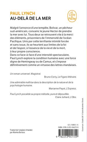 Malgré l’annonce d’une tempête, Bolivar, un pêcheur sud-américain, convainc le jeune Hector de prendre la mer avec lui. Tous deux se retrouvent vite à la merci des éléments, prisonniers de l’immensité de l’océan Pacifique. Unis par cette terrifiante intimité forcée et sans issue, ils se heurtent aux limites de la foi et de l’espoir, à l’essence de la vie et de la mort, à leur propre conscience. Dans ce face-à-face d’une intensité spectaculaire, Paul Lynch explore la condition humaine avec une force digne d’Hemingway ou de Camus, et s’impose définitivement comme un virtuose des lettres irlandaises.