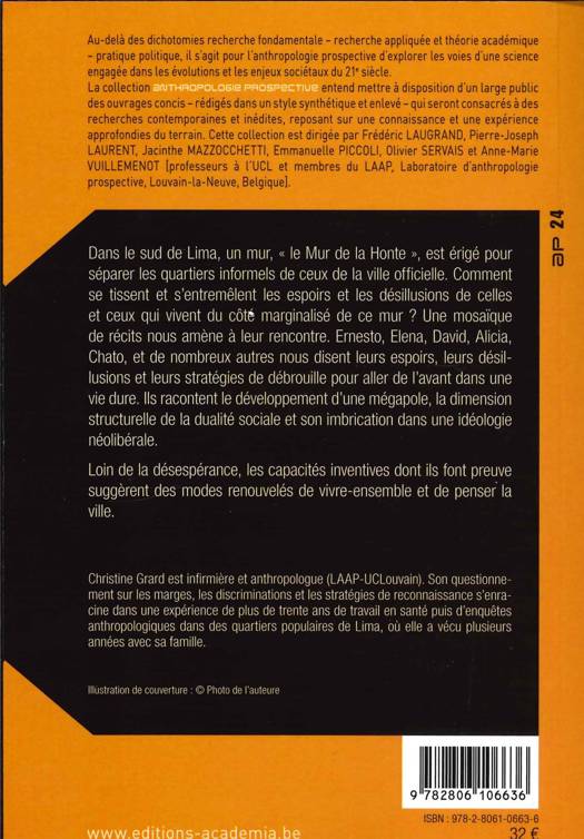Dans le sud de Lima, « le Mur de la Honte » sépare les quartiers informels de ceux de la ville officielle. Comment se tissent et s'entremêlent les espoirs et les désillusions de celles et ceux qui vivent du côté marginalisé de ce mur ? Une mosaïque de récits nous amène à leur rencontre. Ils racontent le développement d'une mégapole, les conditions d'habitat, la violence et la prédation en contexte néolibéral. Ils mettent en lumière les capacités populaires de renouveler la pensée sur ville et la société.
