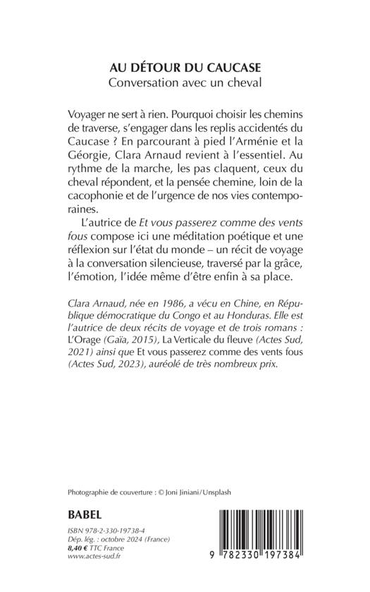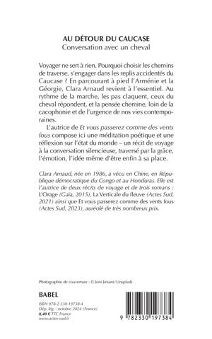 Voyager ne sert à rien. Pourquoi choisir les chemins de traverse, s'engager dans les replis accidentés du Caucase ? En parcourant à pied l'Arménie et la Géorgie, Clara Arnaud revient à l'essentiel. Au rythme de la marche, les pas claquent, ceux du cheval répondent, et la pensée chemine, loin de la cacophonie et de l'urgence de nos vies contemporaines. L'autrice de "Et vous passerez comme des vents fous" compose ici une méditation poétique et une réflexion sur l'état du monde - un récit de voyage à la conversation silencieuse, traversé par la grâce, l'émotion, l'idée même d'être enfin à sa place.