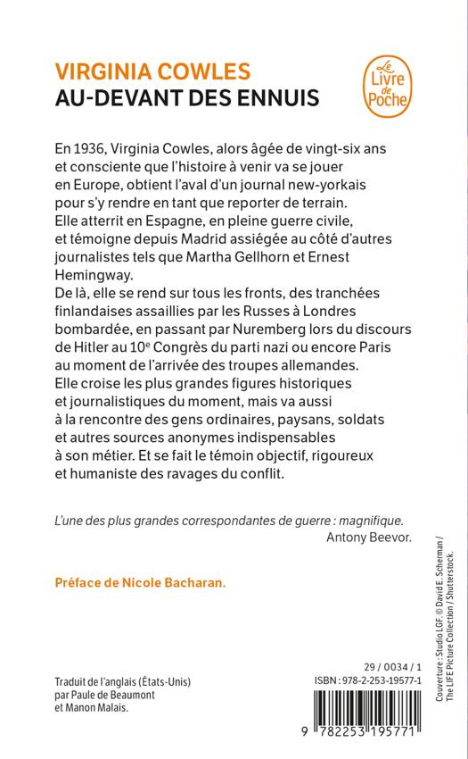 En 1936, Virginia Cowles a vingt-six ans quand, consciente que l’histoire à venir va se jouer en Europe, elle obtient l’aval d’un journal new-yorkais pour s’y rendre en tant que reporter de terrain. Elle atterrit en Espagne, alors en pleine guerre civile, et témoigne de Madrid assiégée aux côtés d’autres journalistes tels que Martha Gelhorn et Ernest Hemingway. De là, elle se rend sur tous les fronts d’Europe, des tranchées finlandaises assaillies par les Russes à Londres bombardée, en passant par Nuremberg lors du discours d’Hitler au 10e congrès du parti nazi ou encore Paris au moment de l’arrivée des troupes nazies. Elle croise les plus grandes figures historiques et journalistiques du moment mais va aussi à la rencontre des gens ordinaires, paysans, soldats et autres sources anonymes indispensables à son métier. Et se fait le témoin objectif, rigoureux et humaniste des ravages de la guerre.