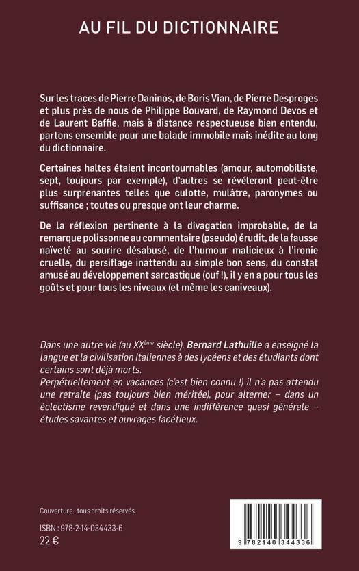 Sur les traces de Pierre Daninos, de Boris Vian, de Pierre Desproges et plus près de nous de Philippe Bouvard, de Raymond Devos et de Laurent Baffie, mais à distance respectueuse bien entendu, partons ensemble pour une balade immobile mais inédite au long du dictionnaire. Certaines haltes étaient incontournables (amour, automobiliste, sept, toujours par exemple), d'autres se révéleront peut-être plus surprenantes telles que culotte, mulâtre, paronymes ou suffisance ; toutes ou presque ont leur charme. De la réflexion pertinente à la divagation improbable, de la remarque polissonne au commentaire (pseudo) érudit, de la fausse naïveté au sourire désabusé, de l'humour malicieux à l'ironie cruelle, du persiflage inattendu au simple bon sens, du constat amusé au développement sarcastique (ouf !), il y en a pour tous les goûts et pour tous les niveaux (et même les caniveaux).