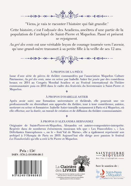 Pièce de théâtre dédiée à l'Histoire de Miquelon liée au sort terrible des Acadiens chassés de leurs terres durant des siècles. La pièce se déroule durant deux époques ; 2016 et 1763 qui se mêlent sur les planches. Passé et présent se rejoignent à l'occasion des 12 ans d'Eva. Sa grand-mère va lui raconter "l'histoire qui fait grandir". Véritable leçon de courage tournée vers l'avenir. Les partitions des chants et musique sont incluses dans le livre. L'Acadie est à l'honneur.