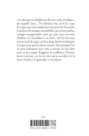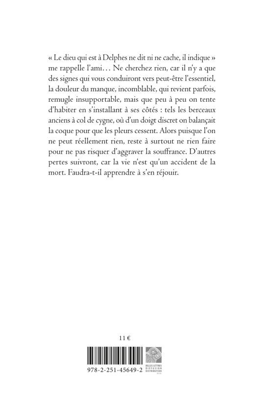 " Le dieu qui est a Delphes ne dit ni ne cache, il indique " me rappelle l'ami Ne cherchez rien, car il n'y a que des signes qui vous conduiront vers peut-etre l'essentiel, la douleur du manque, incomblable, qui revient parfois, remugle insupportable, mais que peu a peu on tente d'habiter en s'installant a ses cotes: tels les berceaux anciens a col de cygne, ou d'un doigt discret on balancait la coque pour que les pleurs cessent. Alors puisque l'on ne peut reellement rien, reste a surtout ne rien faire pour ne pas risquer d'aggraver la souffrance. D'autres pertes suivront, car la vie n'est qu'un accident de la mort. Faudra-t-il apprendre a s'en rejouir.