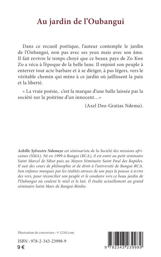 Dans ce recueil poétique, l’auteur contemple le jardin de l’Oubangui, non pas avec ses yeux mais avec son âme. Il fait revivre le temps choyé que ce beaux pays de Zo Kwe Zo a vécu à l’époque de la belle lune. Il enjoint son peuple à enterrer tout acte barbare et à se diriger, à pas légers, vers le véritable chemin qui mène à ce jardin où jaillissent la paix et la liberté.« La vraie poésie, c’est la marque d’une balle laissée par la société sur la poitrine d’un innocent...»